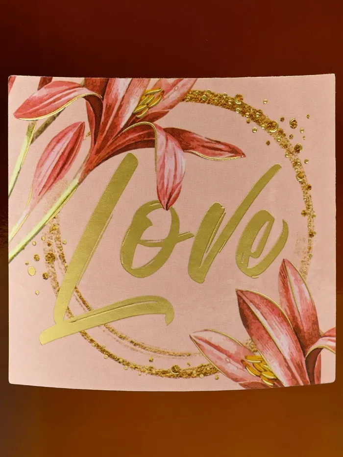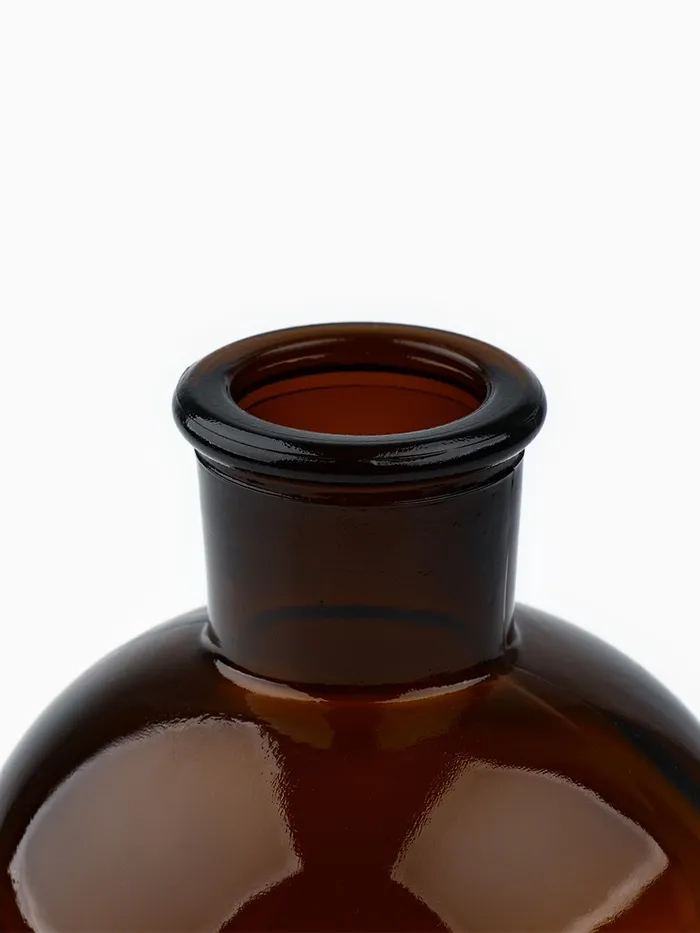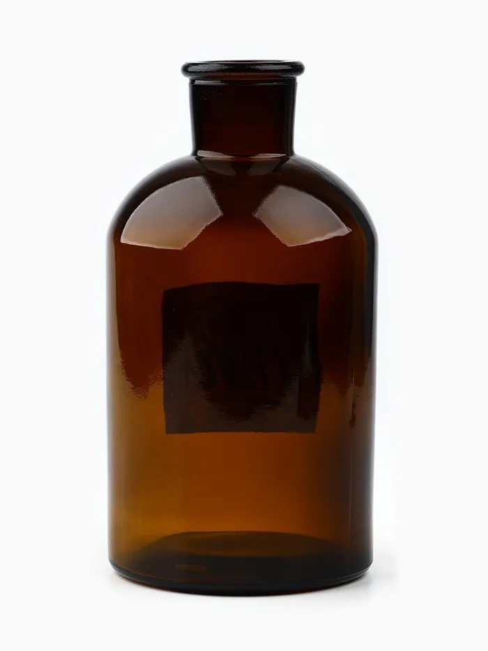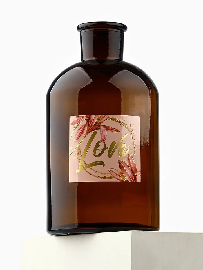 Ваза выполнена из прозрачного стекла коричневого цвета, с наклеенной этикеткой, на которой изображены цветы.