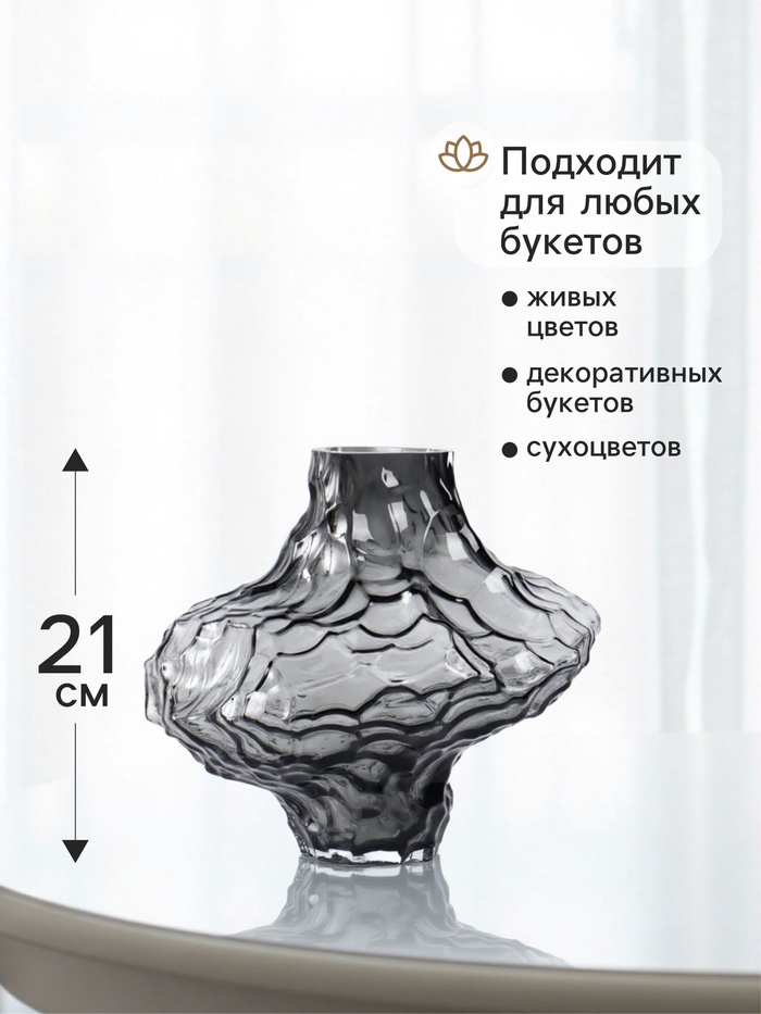 - Компактные размеры: Высотой 21 см и шириной 25 см, ваза легко размещается на столе, полке или комоде. Ее размеры делают ее универсальным предметом для разнообразных интерьеров.