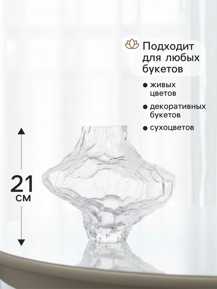 - Качественное прозрачное стекло: Изделие изготовлено из толстостенного стекла, что обеспечивает его устойчивость и долговечность. Материал кристально чистый, без посторонних оттенков, что позволяет цветам оставаться главным акцентом в композиции.