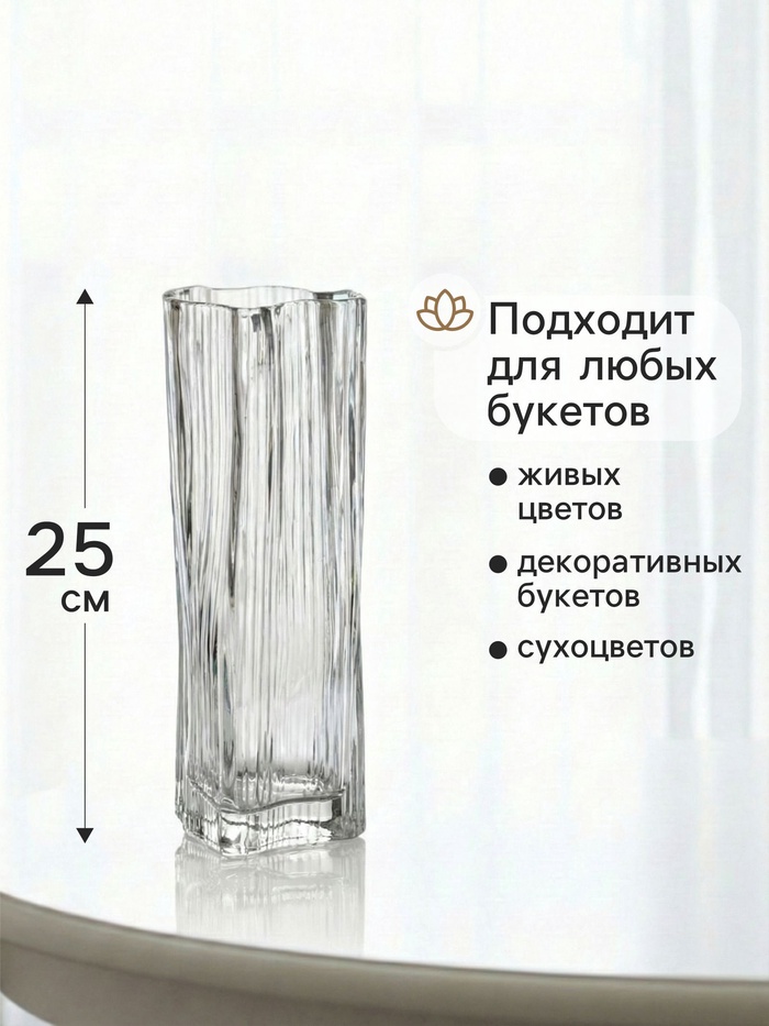 • Практичный размер: Высота 25 см удобна для большинства стандартных букетов. Ваза устойчива на столе, в ней комфортно себя чувствуют высокие и средние стебли, сохраняя их свежесть и презентабельный вид.