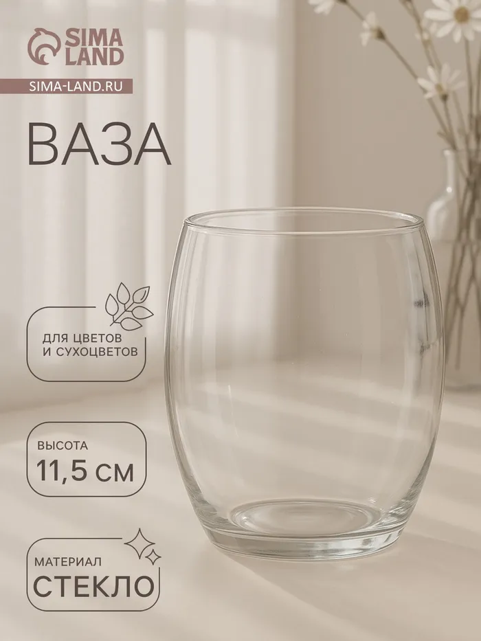 Прозрачная стеклянная ваза — идеальное решение для украшения вашего дома или в качестве подарка на 8 Марта. Эта настольная ваза объёмом 650 мл добавит элегантности и уюта в любое помещение. Высота вазы составляет 11,5 см, что делает её компактной и стильной деталью интерьера.