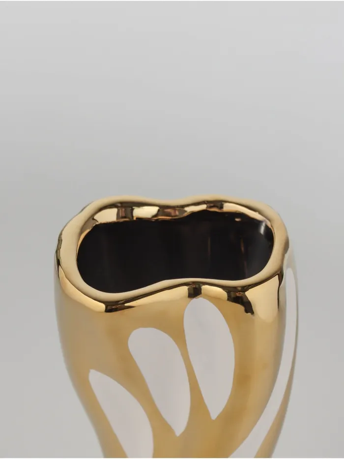 Настольная ваза из керамики с золотисто-белым оформлением – это стильное решение для тех, кто ценит элегантность и уникальный дизайн. Высота 18 см делает её заметной, но при этом компактной, что позволяет легко интегрировать её в любой интерьер.