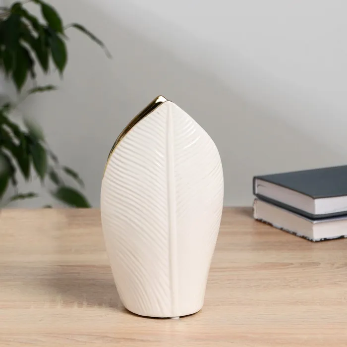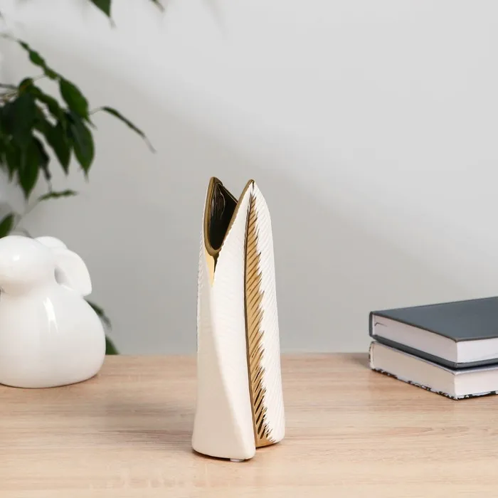 Белая керамическая ваза с золотистым декором станет стильным акцентом в вашем интерьере. Изящные рельефные элементы добавляют изысканность, а настольная форма с высотой в 20 см делает её идеальной для гостиной или офиса.