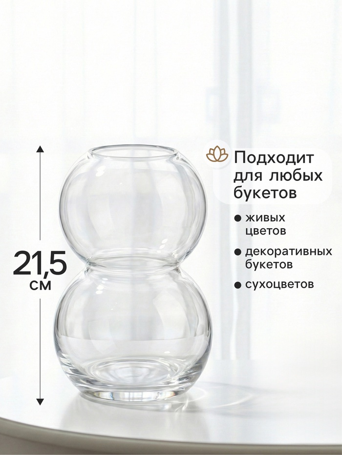 - Универсальный размер: Высота 21,5 см идеально подходит для средних и длинностебельных цветов — роз, тюльпанов, гербер, хризантем. Ваза устойчива и хорошо смотрится как в центре обеденного стола, так и на журнальном столике или полке.