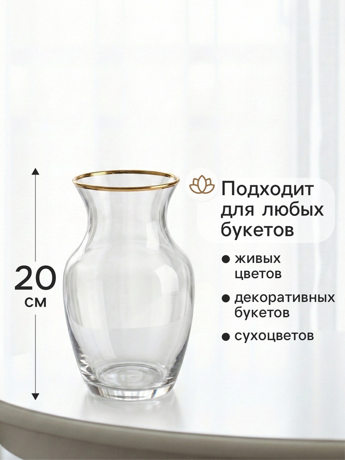 - Стекло с золотым акцентом: Прозрачное стекло подчеркивает красоту цветов, а тонкая золотая отделка добавляет изюминку. Это делает вазу универсальной: она гармонирует как с классической, так и с современной обстановкой.