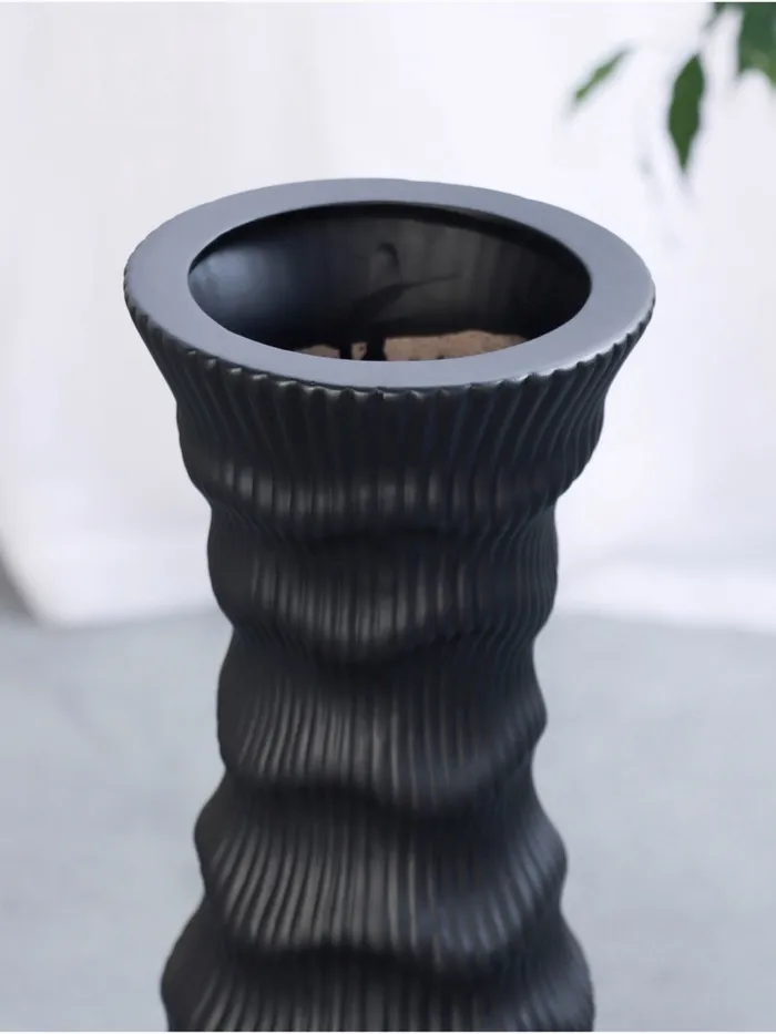 - Универсальность: черный цвет и стильный вид позволяют использовать вазу в различных интерьерах — от классического до современного.