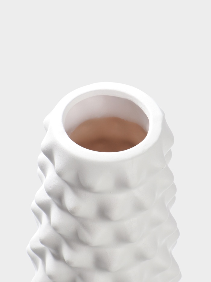 - Выразительный рельеф: Поверхность вазы украшена объемным узором. Это не просто украшение — тактильная текстура делает объект интересным для рассмотрения с любого ракурса и добавляет интерьеру динамики.