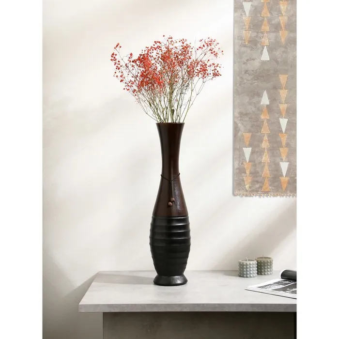 - Статусная высота 58 см: Такой размер вазы позволяет ей уверенно стоять на полу, не теряясь в пространстве. Она становится полноценным элементом обстановки, способным зонировать комнату или завершить композицию у дивана, стеллажа или в нише.