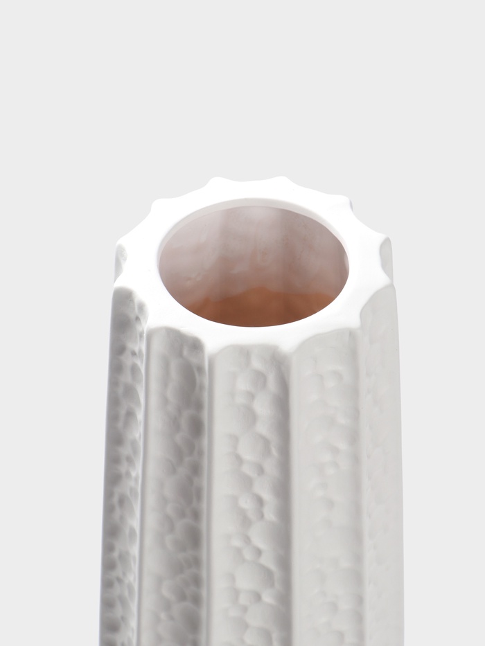 - Выразительный рельеф: Поверхность вазы украшена тактильным узором. Игра света и тени на фактуре оживляет монохромный объём, добавляя глубину и характер даже без наполнения.