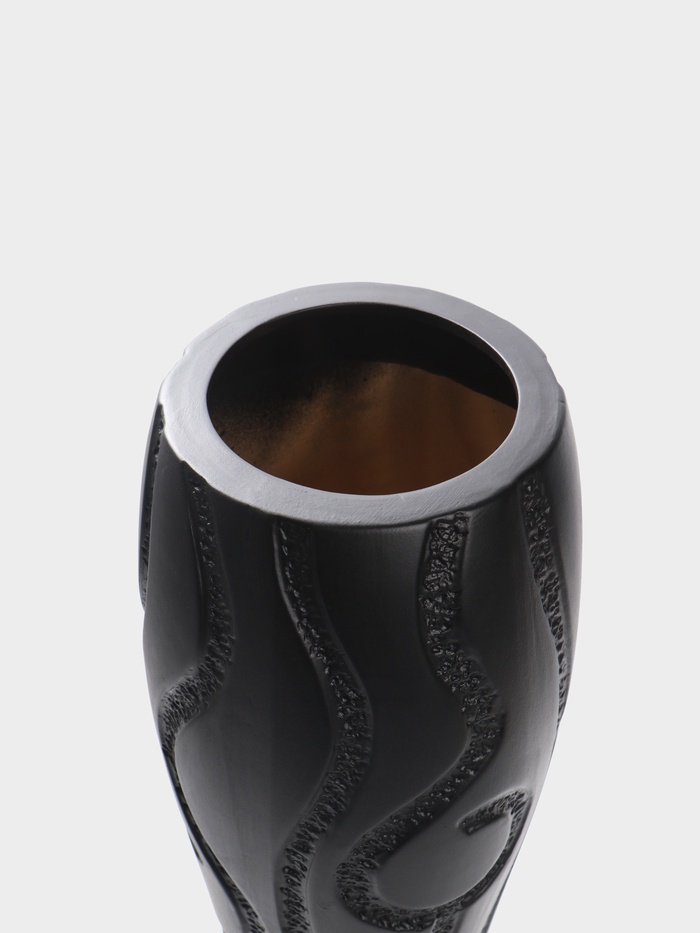 - Выразительный рельеф: Поверхность вазы — это не просто гладкая керамика. Фактурный рисунок играет со светом, отбрасывая динамичные тени. Такой текстурный акцент оживляет монохромную гамму, придавая предмету тактильную выразительность и визуальную глубину.