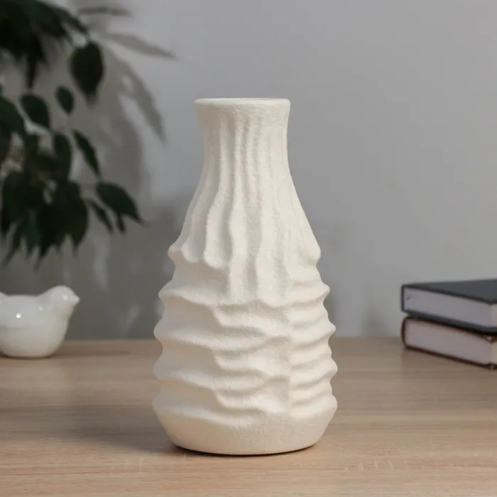 Эта ваза отлично подходит для композиций из сухоцветов, веток или как самостоятельный декоративный элемент. Она также станет стильным подарком для ценителей минимализма и современного дизайна. Добавьте в своё пространство нотку изысканности — выберите белую керамическую вазу с рельефной текстурой!
