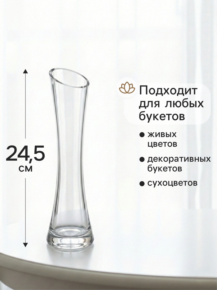 - Идеальные пропорции для букетов: Высота в 24,5 см оптимальна для средних и длинностебельных цветов — роз, тюльпанов, гербер или веточек. Ваза надежно удержит композицию, позволяя цветам раскрыться во всей красе.