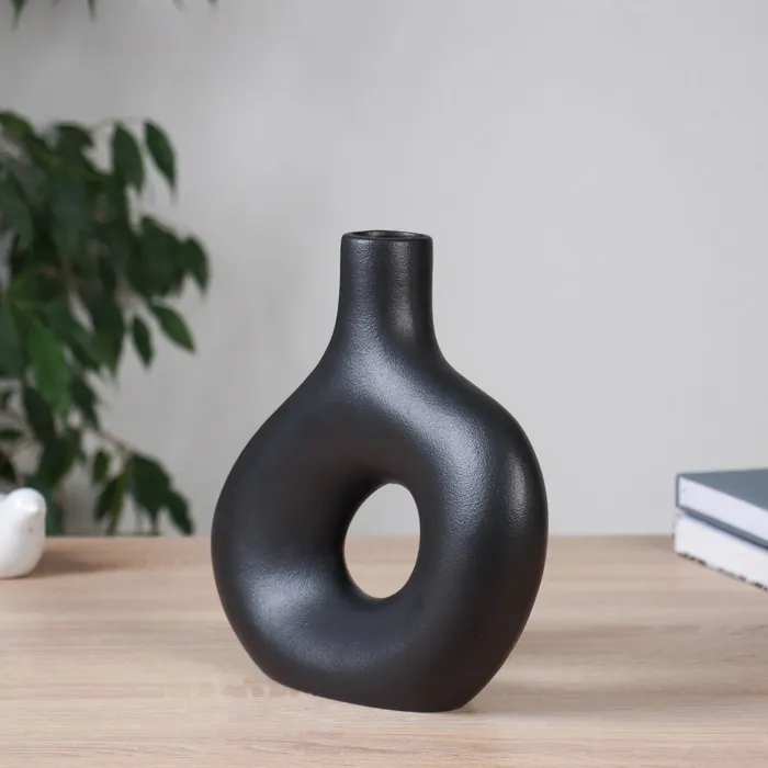 - Уникальная форма и дизайн: овальная форма черной керамической вазы делает её идеальным акцентом на столе или полке, добавляя динамику и глубину в интерьер. Геометрический дизайн хорошо вписывается в современные и минималистичные стили.
