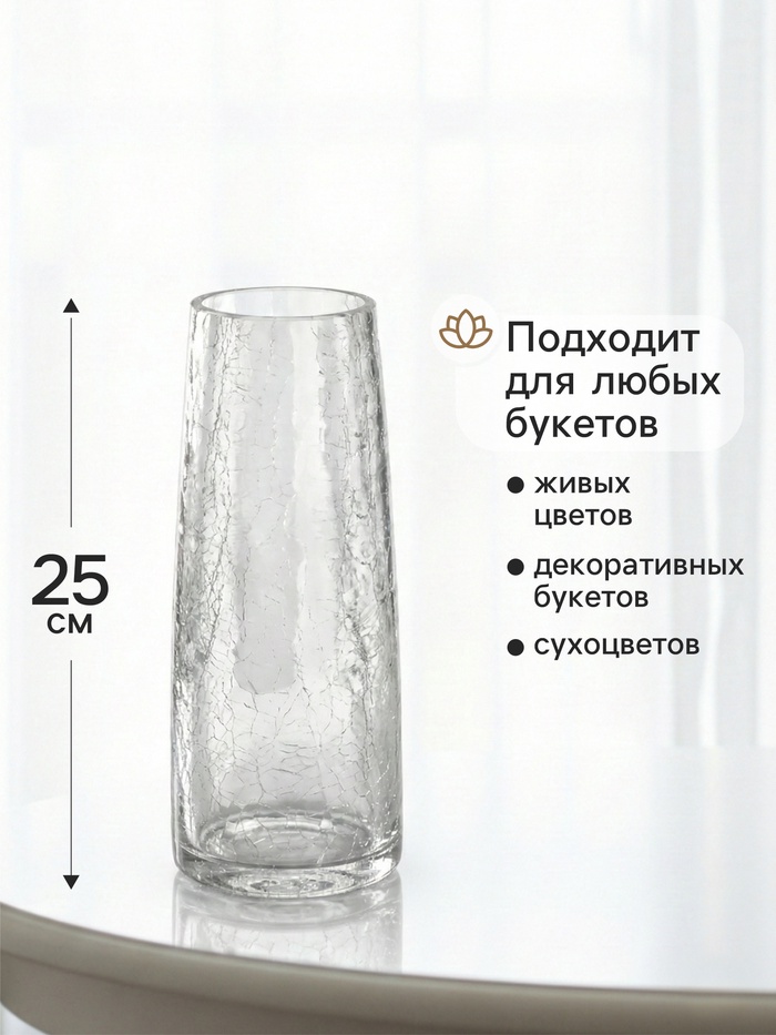 • Идеальные пропорции: Высота 25 см и диаметр 10 см — это универсальный размер для настольной вазы. В ней эффектно смотрятся как высокие стройные стебли (ирисы, тюльпаны, ветки), так и пышные букеты среднего размера. Ваза устойчива и не перевернется.