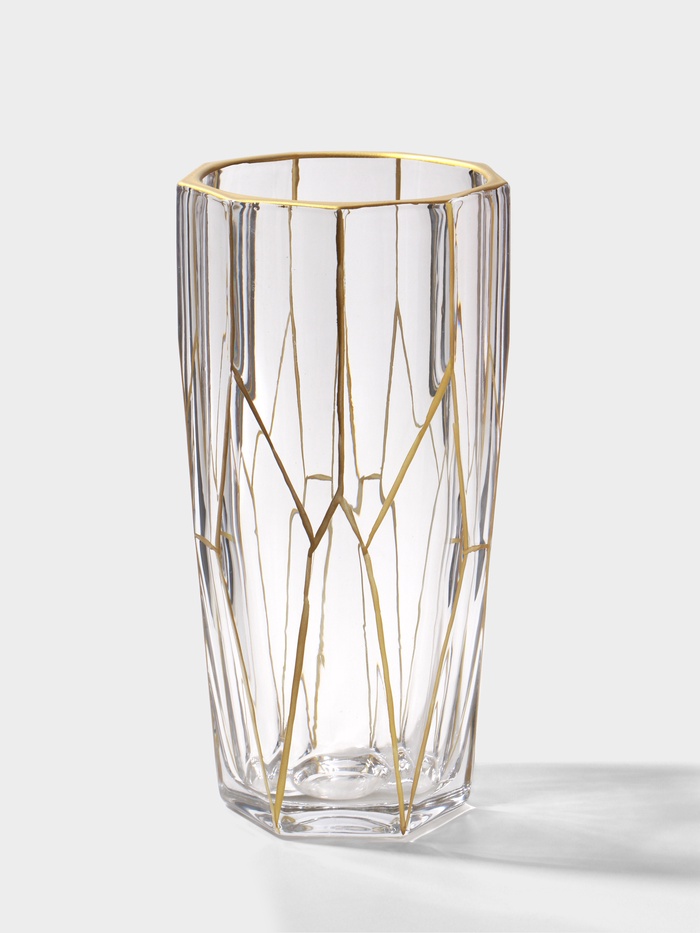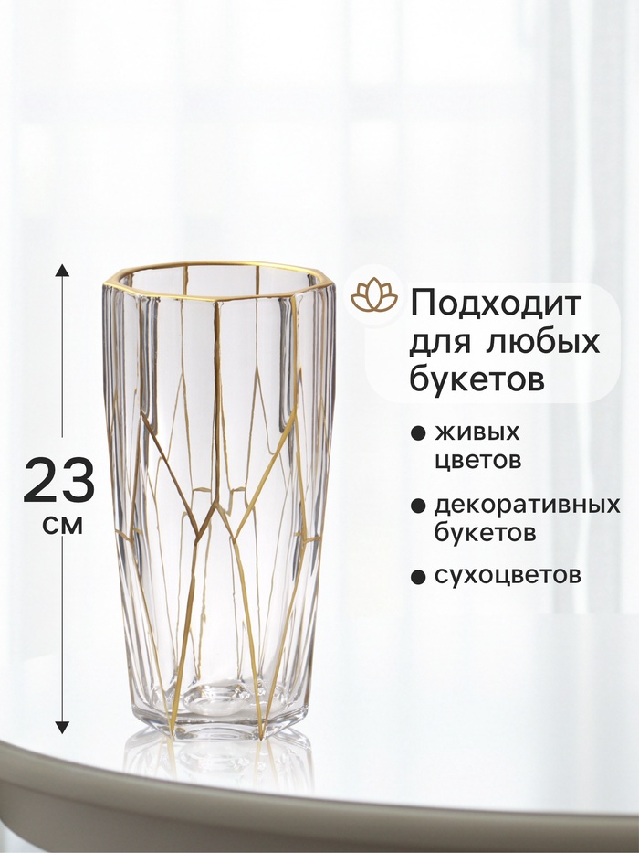- Выразительный рельеф и золотой акцент: Поверхность вазы украшена золотыми полосками, которые создают рельеф и оживают при свете. Тонкие золотые прожилки добавляют тепла и роскоши прозрачному стеклу, создавая эффект драгоценного кристалла.