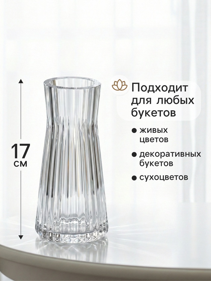 - Универсальность в деталях: Прозрачность и простая форма позволяют содержимому вазы стать главным акцентом. Используйте её для романтичных роз, полевых цветов, стильных сухоцветов или как самостоятельный предмет декора.