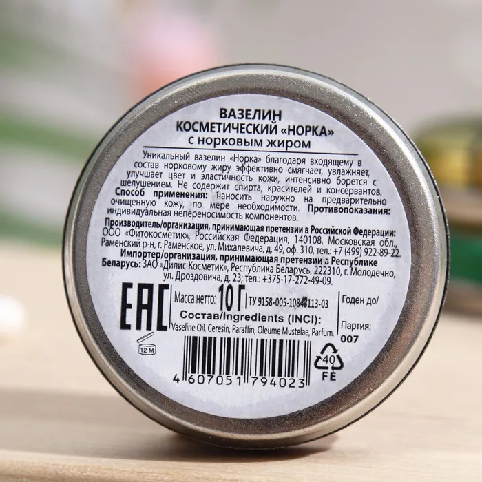 Вазелин косметический "Норка" с норковым жиром, 10 г — Характеристики