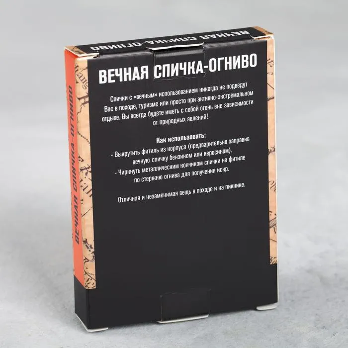 Чтобы высечь искру, достаточно чикнуть наконечником стержня по магниевой полосе, расположенной на корпусе спички, после чего фитиль будет гореть в течение 10-15 секунд.
