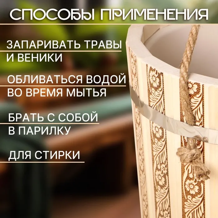 Ведро - запарник для бани и сауны "Русские узоры", 10 л, липа, пластиковая вставка, ручка - верёвка, «Добропаровъ» — Характеристики