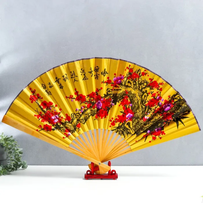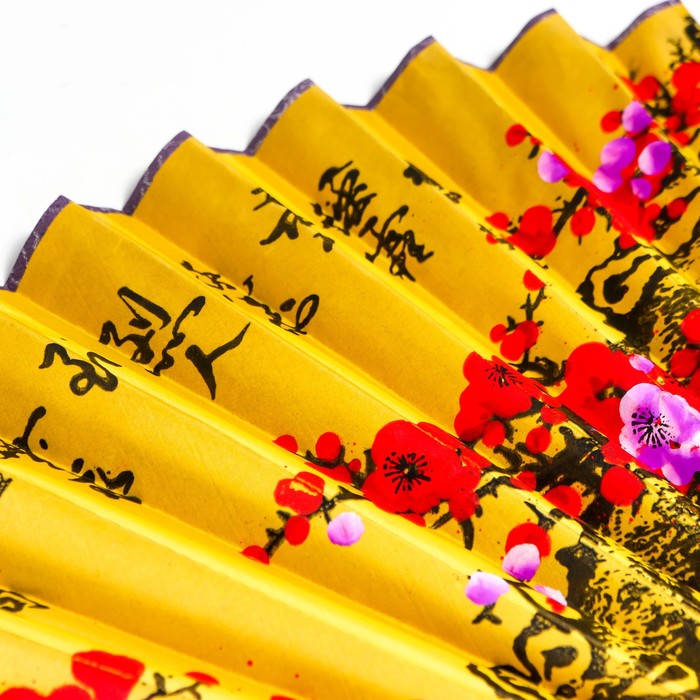 Добавьте ноту восточной эстетики в ваш интерьер с этим изысканным складным веером. Его нежные лепестки сакуры на солнечно-жёлтом фоне словно перенесут вас под цветущие ветви японской вишни, создавая атмосферу гармонии и умиротворения.