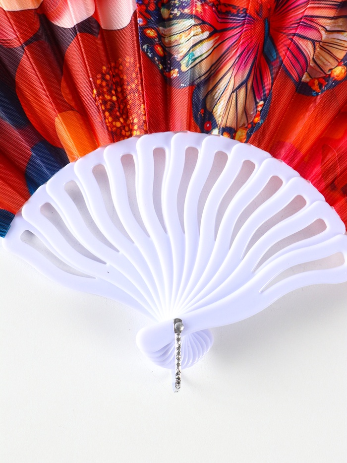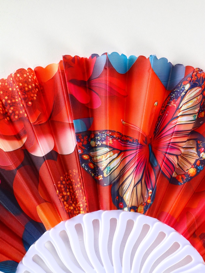 Веер создаёт приятную прохладу, когда это необходимо больше всего. Легкость и компактность позволяют всегда иметь его при себе. Узор из бабочек и цветов добавляет образу утонченности и лёгкости, напоминая о летнем саде. Это практичное решение с художественным оформлением для повседневности и особых случаев.