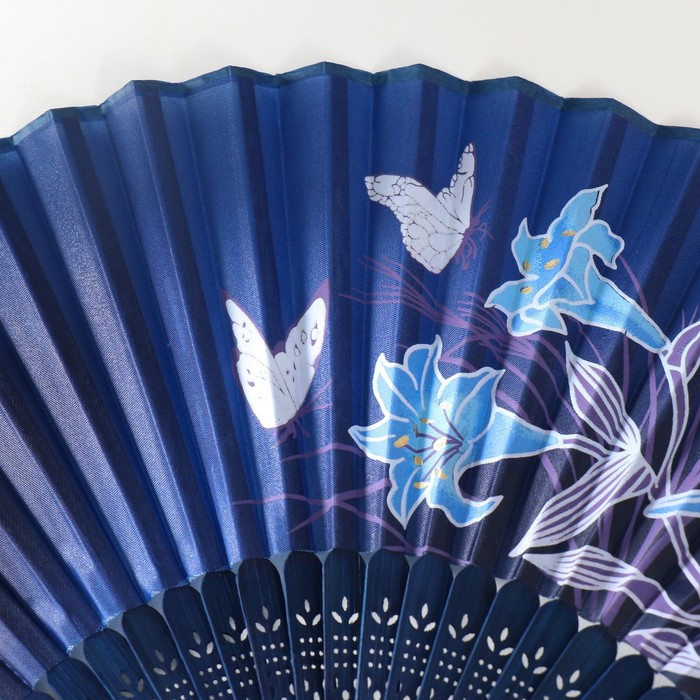 Веер складной h=21 см «Синии лилии и бабочки», синий, с кисточкой — Характеристики