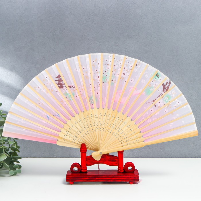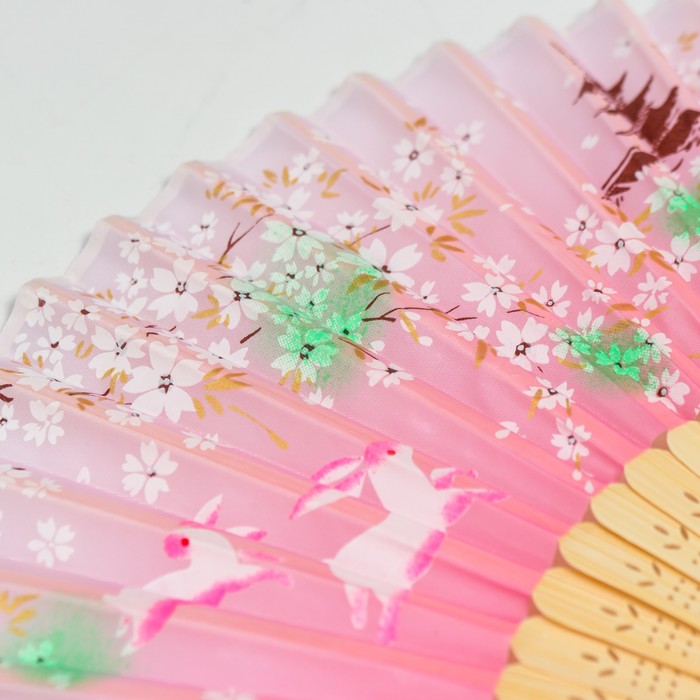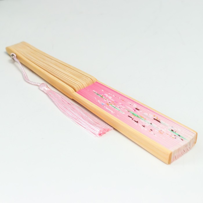 Веер складной h=21 см «Зайчики у сакуры», розовый, с кисточкой — Характеристики