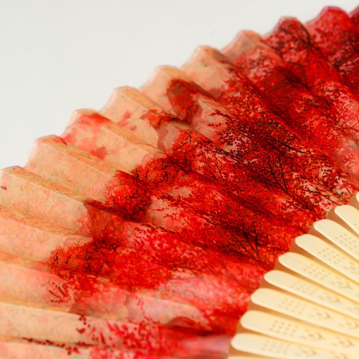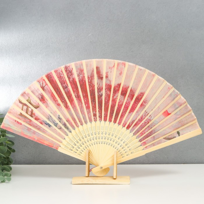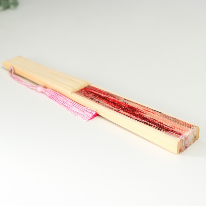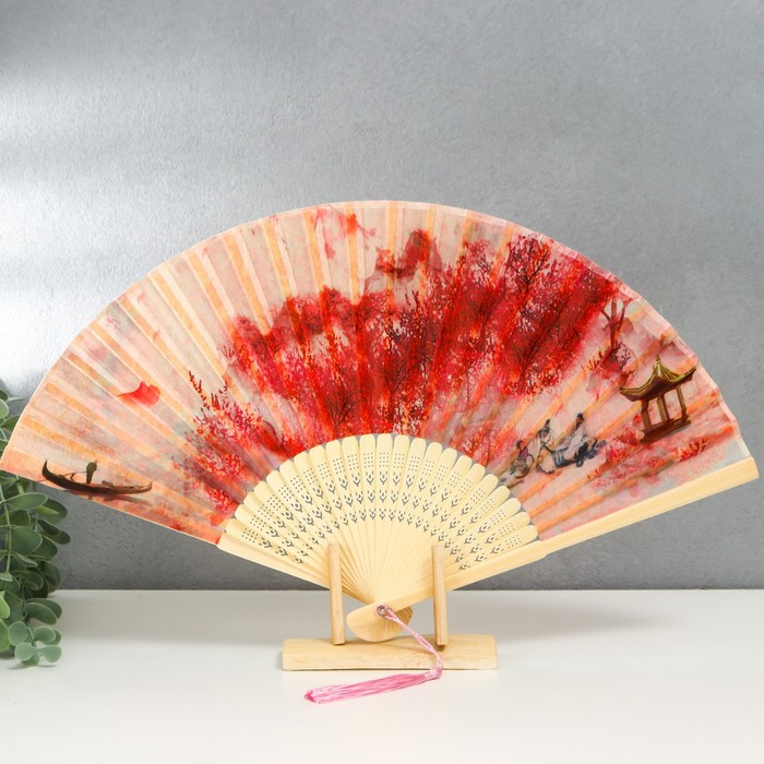 Веер складной h=23 см «Вечер на реке», бамбук, текстиль, красный, с кисточкой — Характеристики