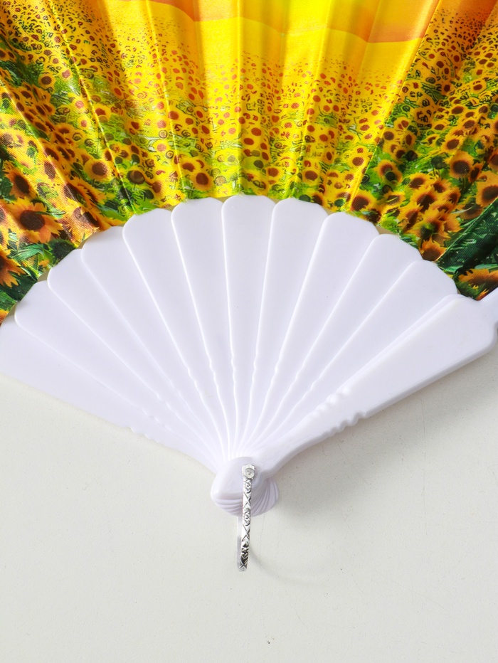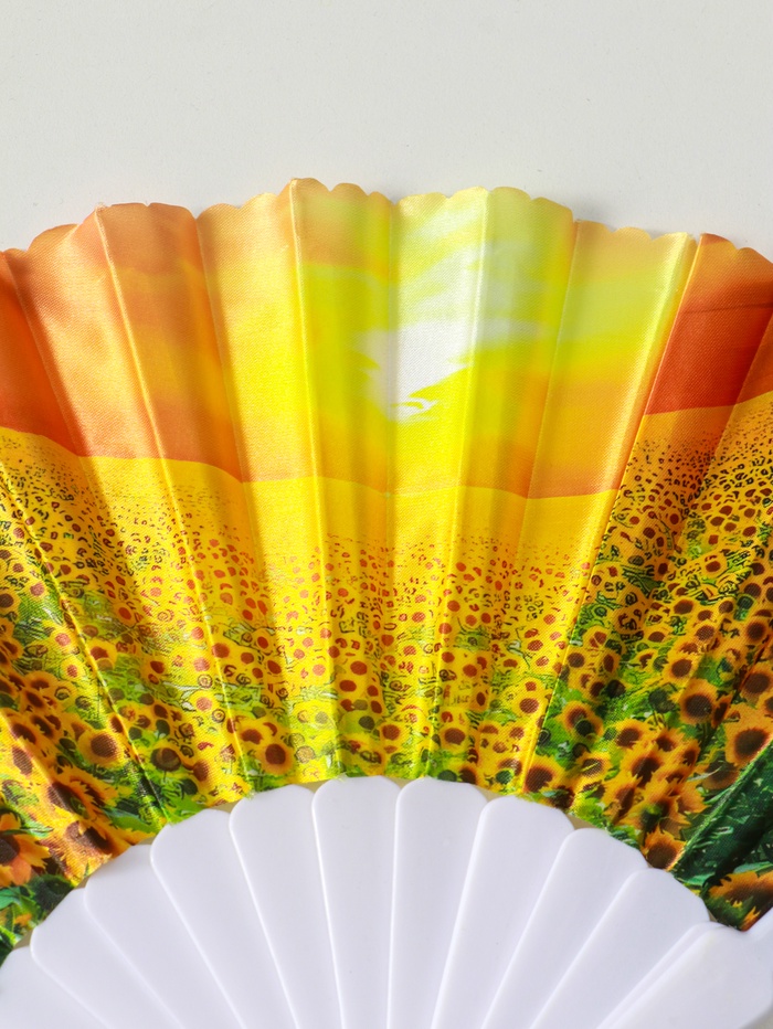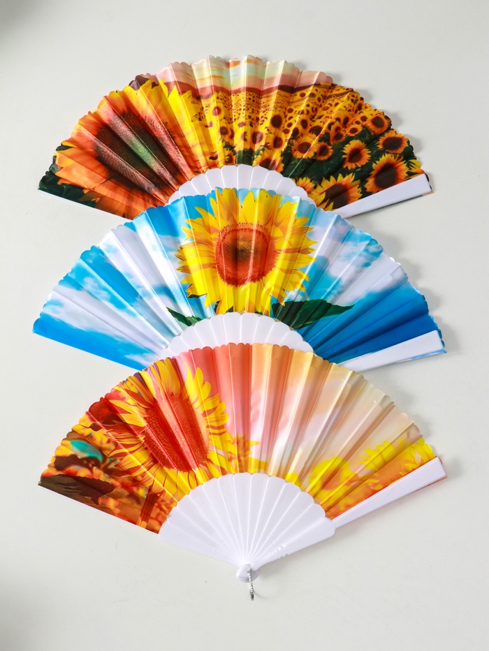 Этот складной веер с широкими лопастями станет вашим личным источником прохлады в летний зной. Он легко помещается в сумку, раскрывается одним движением и создаёт приятный поток воздуха. Яркий принт с подсолнухами поднимает настроение, превращая обычный аксессуар в элемент летнего стиля.