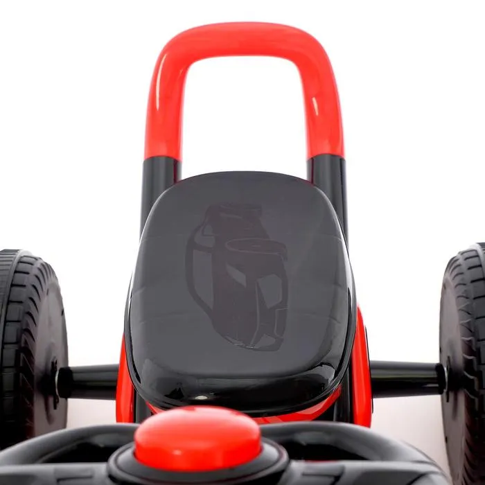 - Стильный корпус ярко-красного цвета с наклейками делает веломобиль заметным и привлекающим внимание, добавляя каждому заезду настроение и индивидуальность.