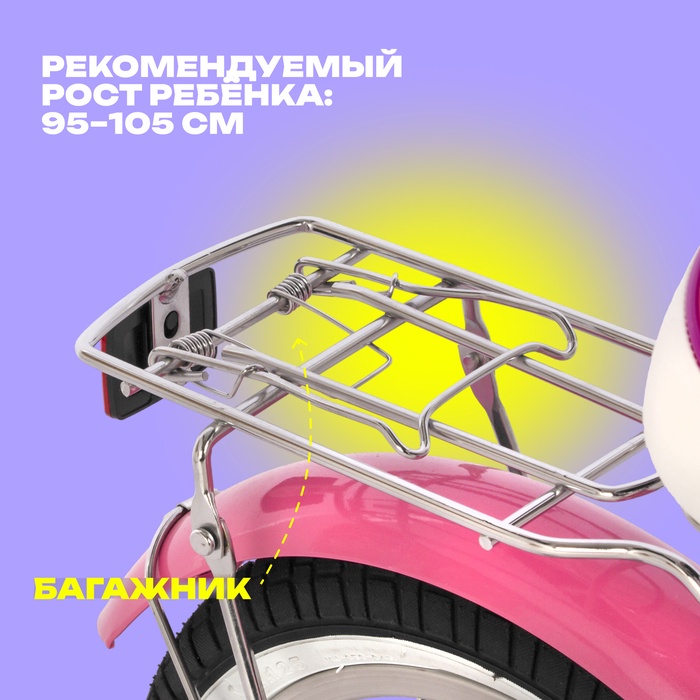 Велосипед подойдёт для девочек от 3 до 5 лет. Модель оснащена корзинкой, багажником, звонком, зеркалом заднего вида и катафотами.
