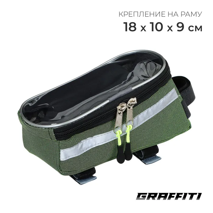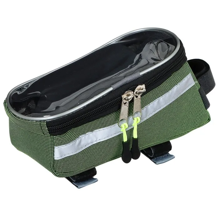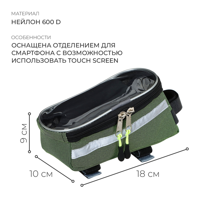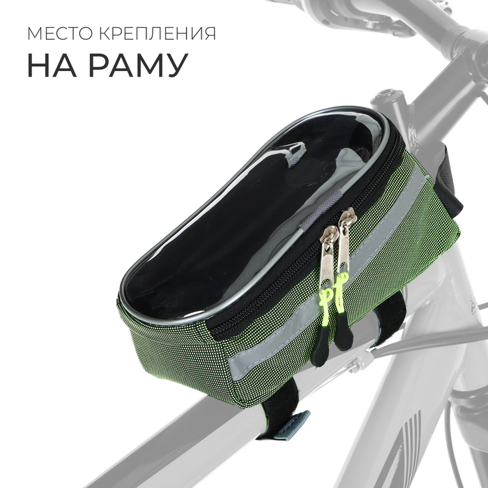 Сумка крепится на верхнюю трубу рамы. Держит форму за счёт мягких вставок. Оснащена отделением для смартфона с возможностью использовать тачскрин.