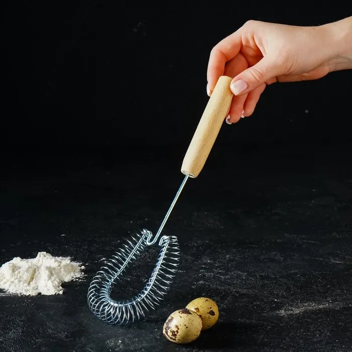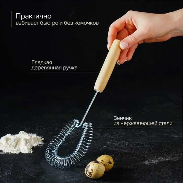 Венчик прочный и надежный, что позволяет использовать его для смешивания различных ингредиентов, таких как мука, сахар, яйца, масло и другие продукты.