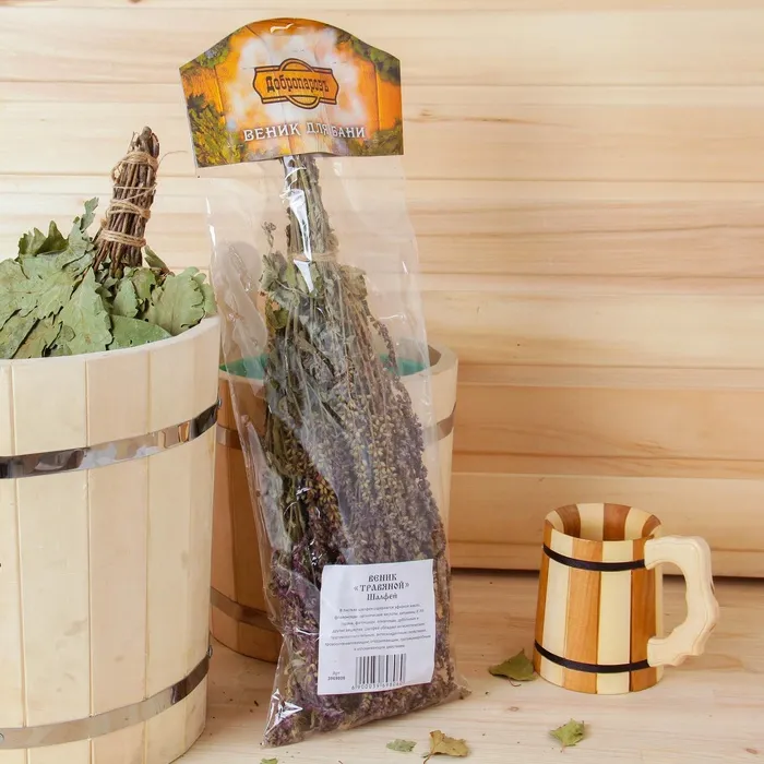 При распаривании шалфейного веника баня наполнится свежим пряным ароматом, который снимает стресс, оказывает антисептические и противовоспалительные эффект.