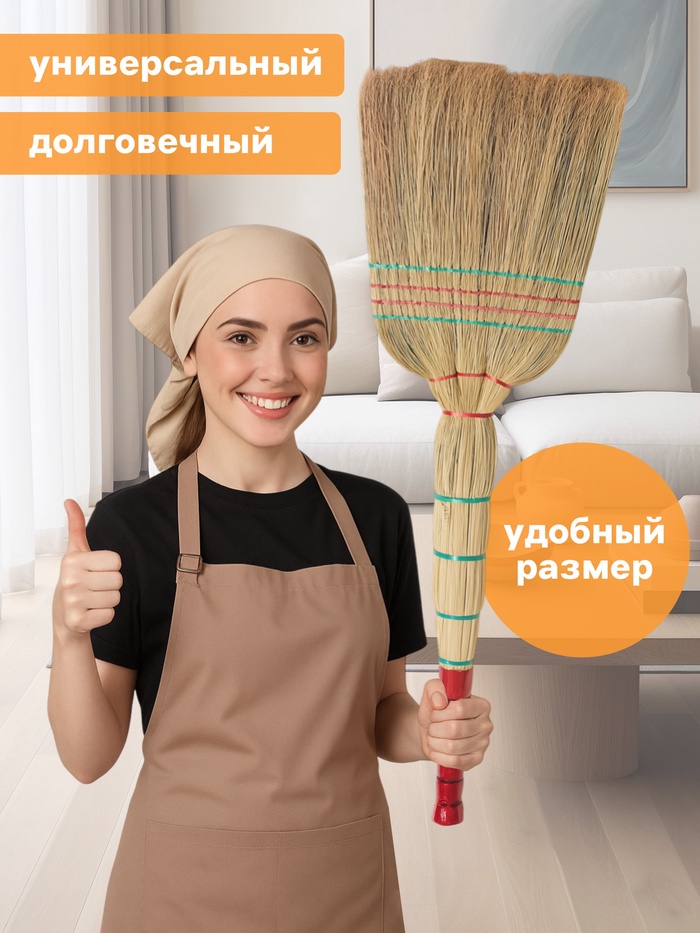 Узбекский веник из сорго — прочное и удобное решение для уборки дома и двора. Изготовлен вручную из натурального сорго, отличается повышенной износостойкостью. Плоская форма метлы (длина 90-95 см) обеспечивает эффективное подметание, а деревянный черенок делает использование комфортным. Цвет — натуральный бежевый.