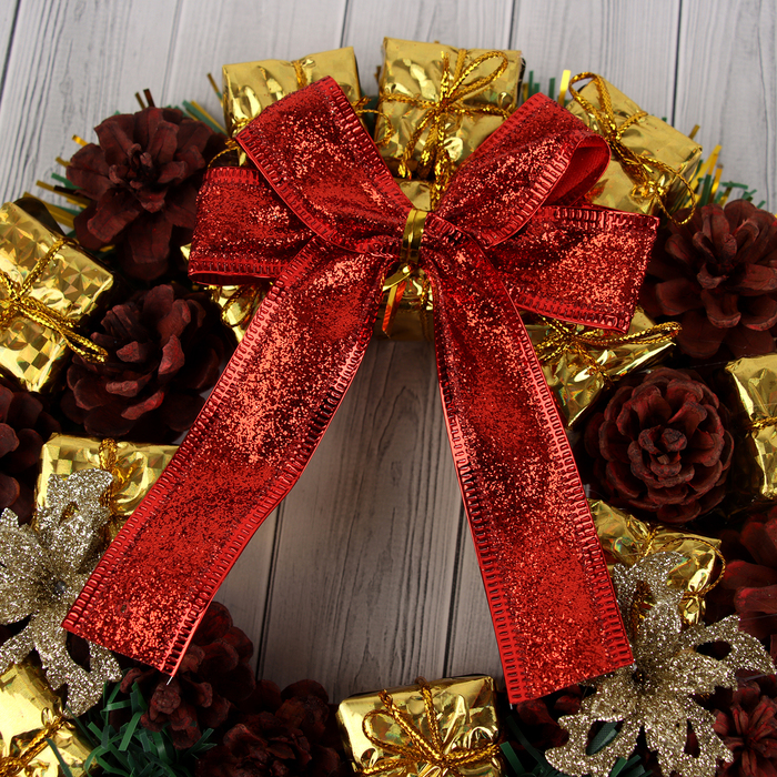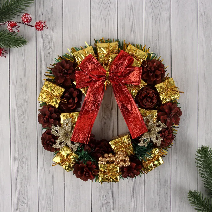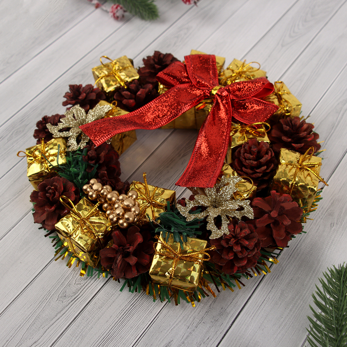 Венок новогодний d=22 см «Зимнее волшебство. Бант», бант с шишками и подарками — Характеристики