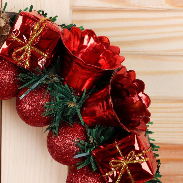 Венок новогодний d=22 см «Зимнее волшебство», с красными шариками, колокольчиками и подарками — Характеристики