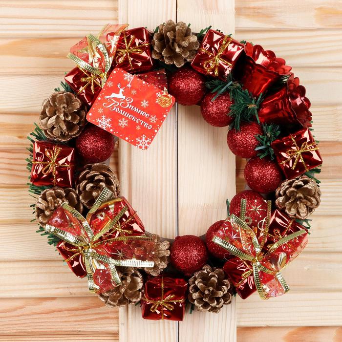 Венок новогодний d=22 см «Зимнее волшебство», с красными шариками, колокольчиками и подарками