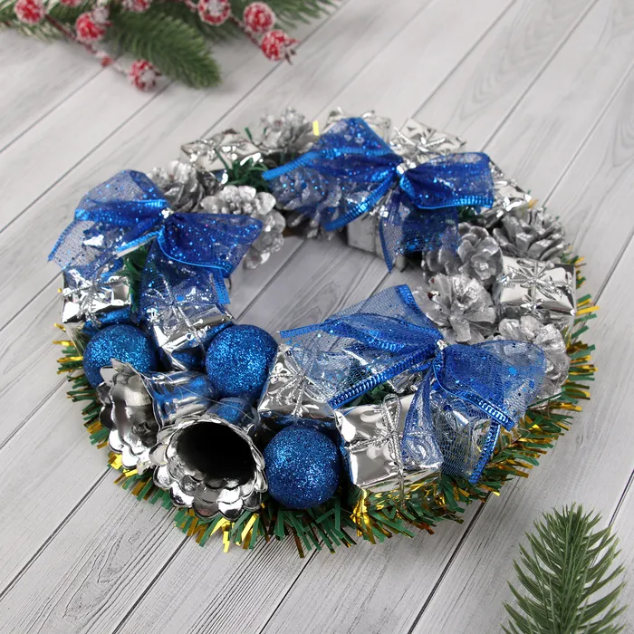Венок новогодний d=22 см «Зимнее волшебство», с синими бантами и шариками — Характеристики