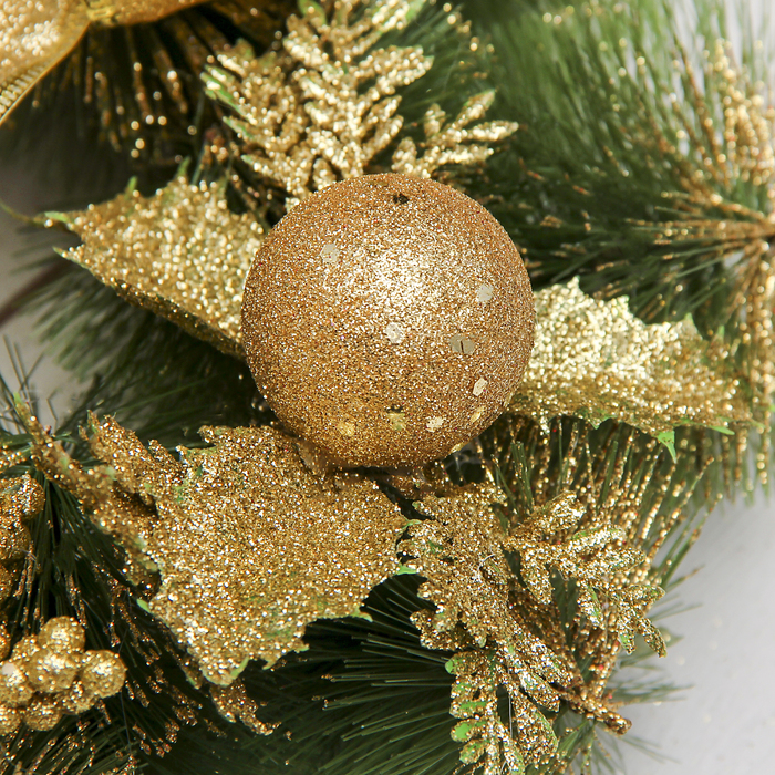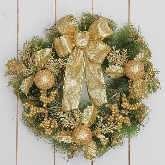 Приготовьтесь встретить праздник с особой элегантностью благодаря этому новогоднему украшению. Венок диаметром 28 см станет идеальным акцентом для вашей входной двери или стены, создавая атмосферу торжества.