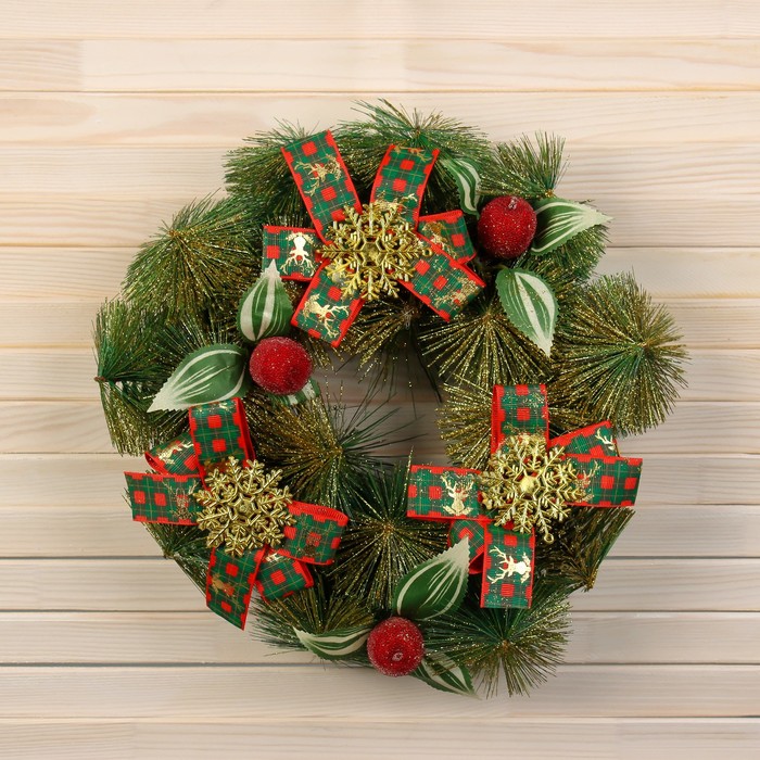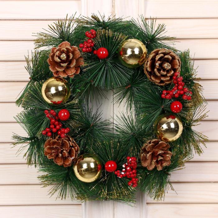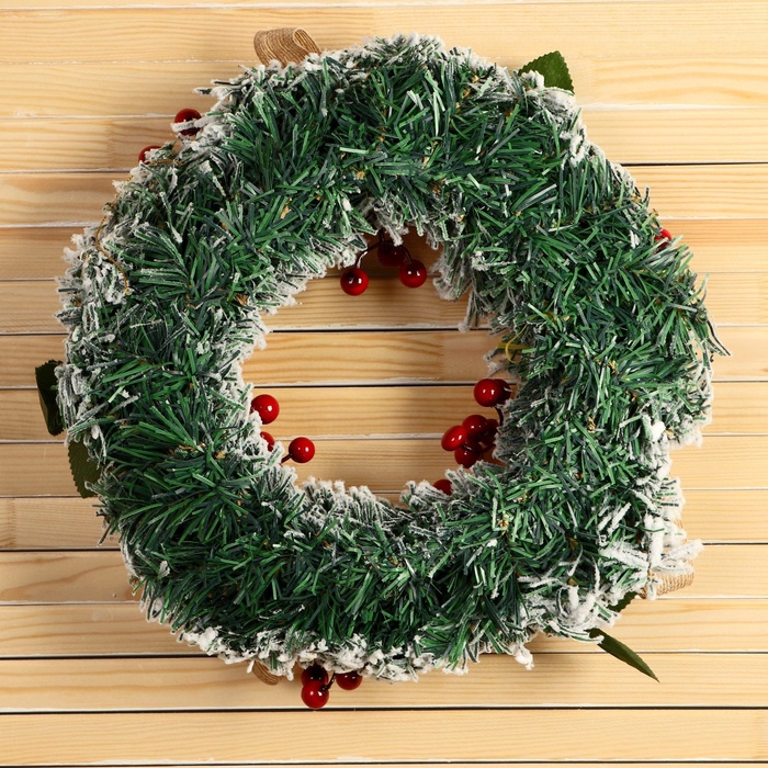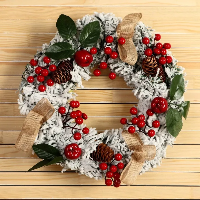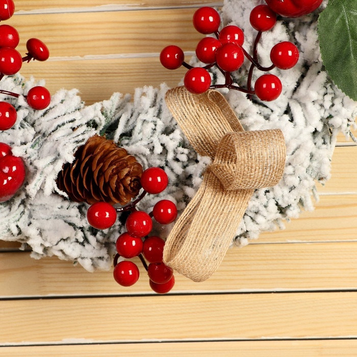Новогодний венок диаметром 29 см станет стильным украшением для двери или стены, создавая атмосферу зимнего уюта и праздничного настроения. Белые оттенки в сочетании с натуральными элементами — ягодами, шишками и снежным покрытием — подчёркивают скандинавский и классический дизайн.