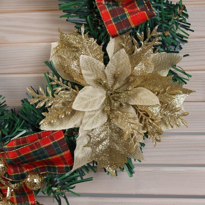 Добавьте шарм Вашему праздничному декору с этим изящным золотистым венком. Его элегантный дизайн и стильная отделка привнесут тепло и уют, создавая атмосферу новогоднего волшебства в вашем доме.