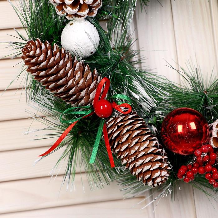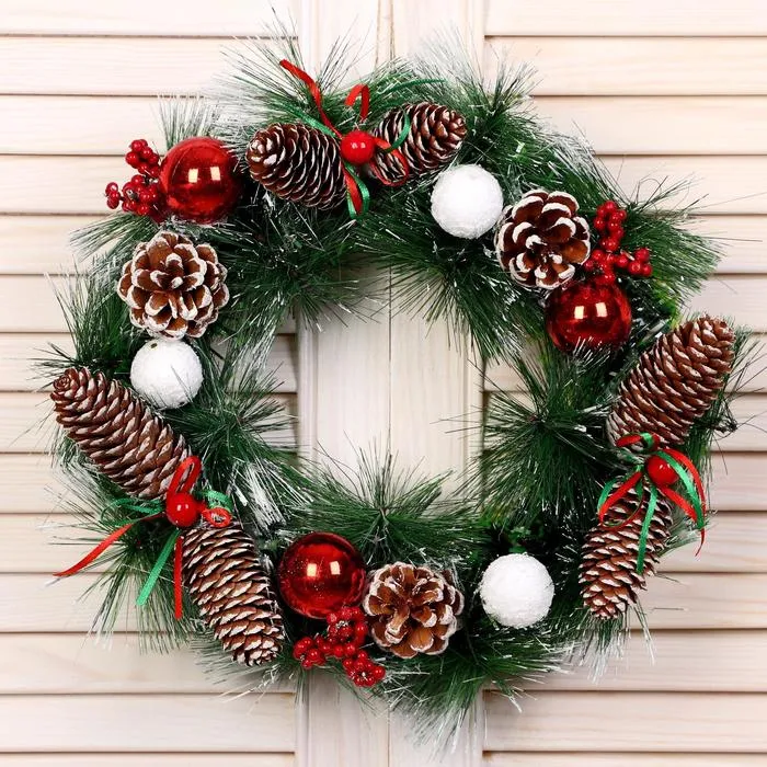 Стильный венок станет прекрасным украшением для Вашего дома. Элементы декора в виде шишек и шариков позволяют добавить яркие акценты, а гармоничное оформление придаёт Вашему пространству уникальный шарм.Его можно разместить как на двери, так и на стене, превращая любую комнату в зимнюю сказку. Праздничные элементы способствуют созданию уютного пространства и подчеркнут вашу любовь к новогодним традициям.