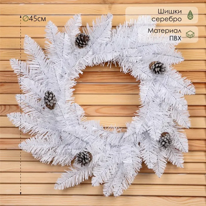 Венок новогодний d=45 см «Белый» декор шишка, серебро — Характеристики