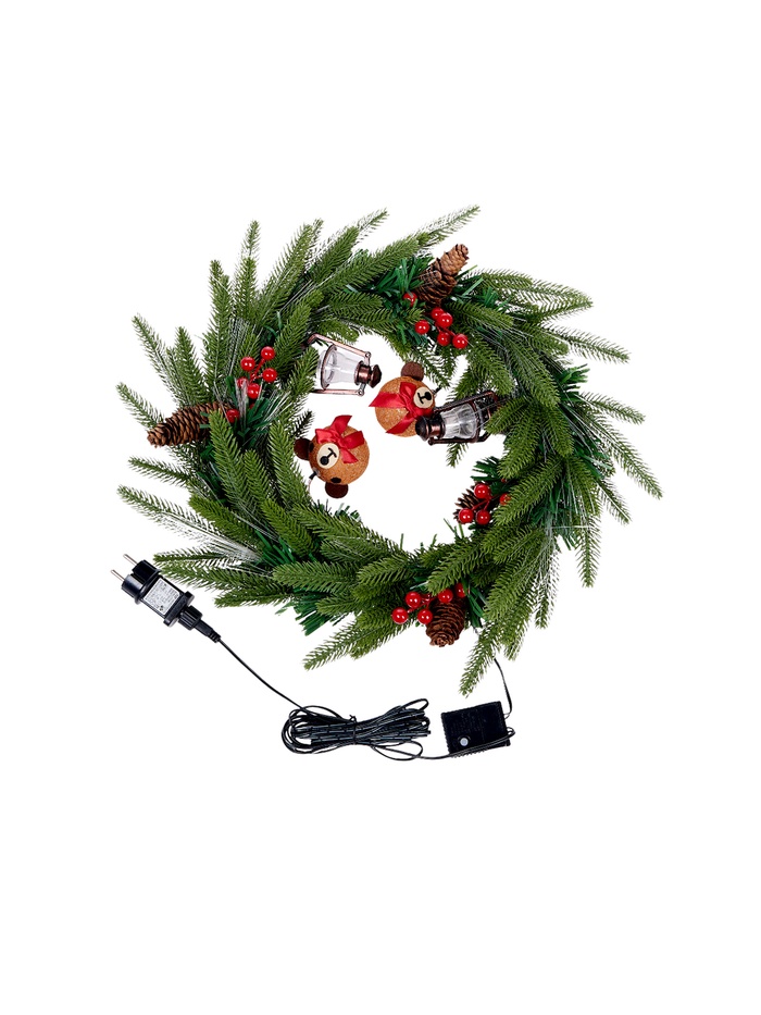 Фиброоптический венок диаметром 50 см создаёт яркую праздничную атмосферу в любом помещении. Восемь режимов подсветки оживляют интерьер, делая декор выразительным и динамичным. Зелёная хвоя и разноцветные украшения гармонично дополняют друг друга, создавая ощущение естественного новогоднего венка.