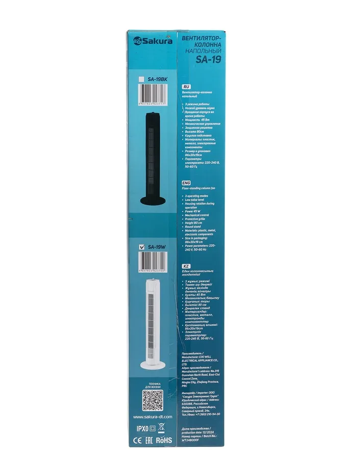 Вентилятор Sakura SA-19W, колонный, напольный, 45 Вт, 80 см, 3 режима, механический, белый — Характеристики