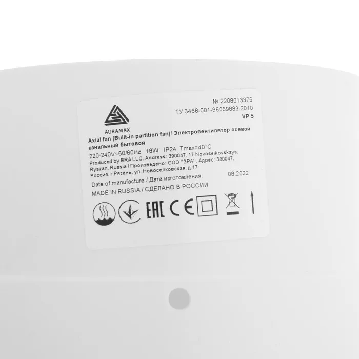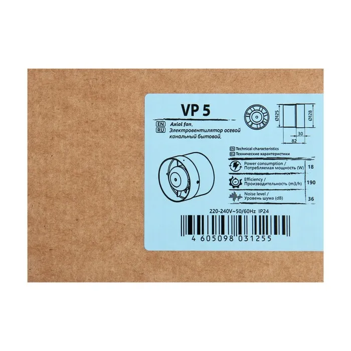 Вентилятор вытяжной AURAMAX VP 5, 128×128 мм, d=125 мм, 220 В, 18 Вт, 36 дБ, канальный — Характеристики
