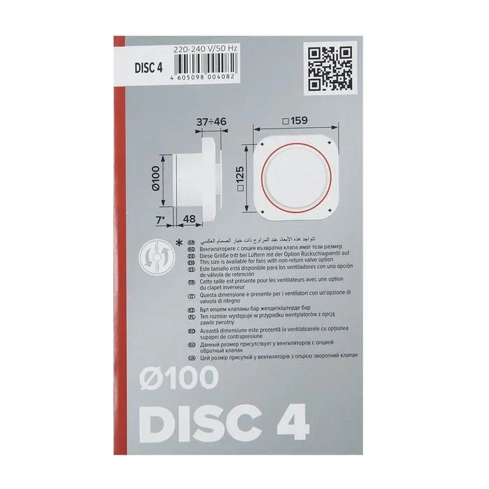 Вентилятор вытяжной ERA DISC 4, 160×140 мм, d=100 мм, 220-240 В — Характеристики