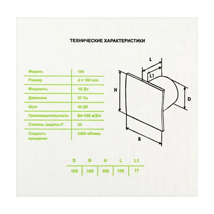 Вентилятор имеет стандартный диаметр канала 100 мм, что облегчает подключение к существующей системе вентиляции. Отсутствие вилки позволяет подключить устройство напрямую к электросети, минимизируя риск неисправностей.