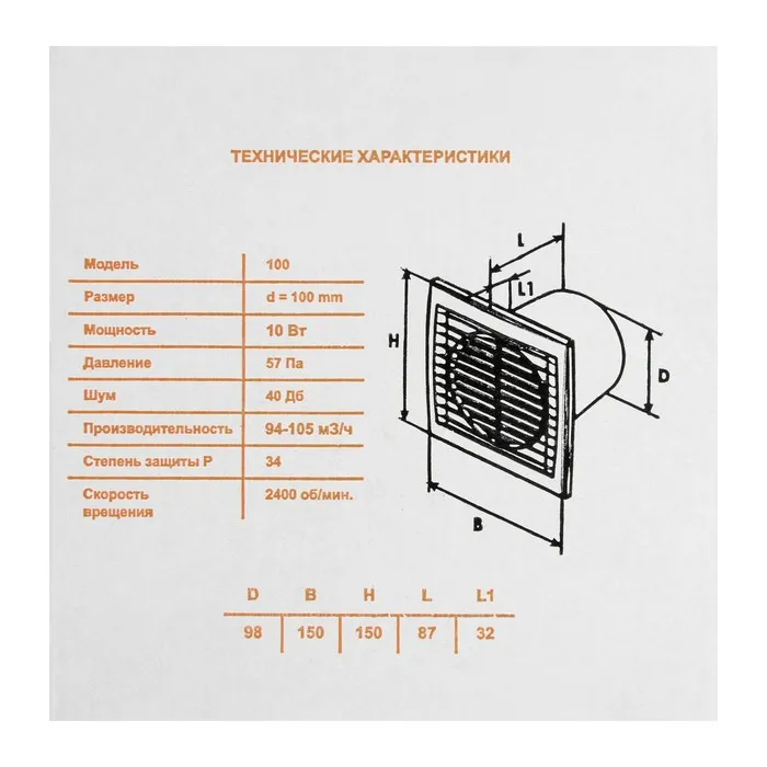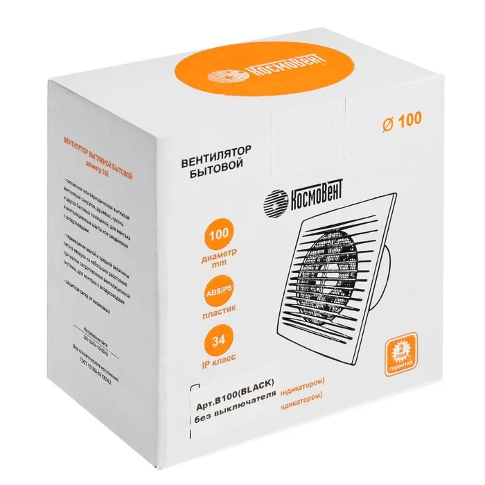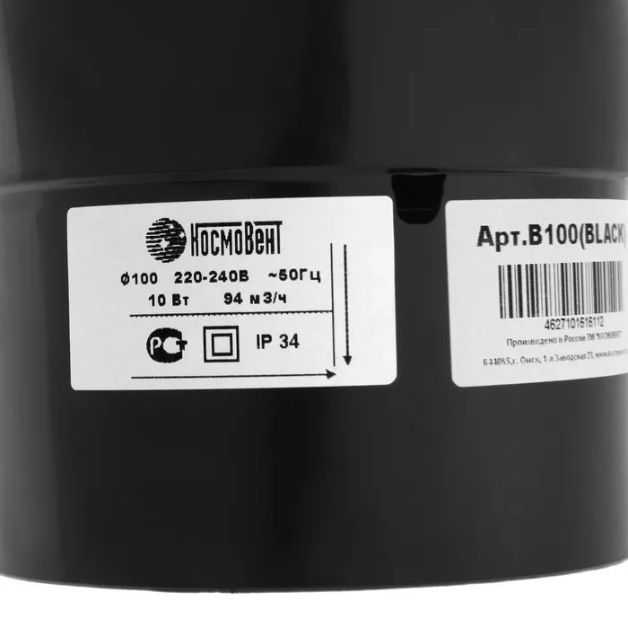 Вентилятор вытяжной «КосмоВент» В100, d=100 мм, 10 Вт, 40 дБ, 105 м³/ч, без выключ, черный — Характеристики